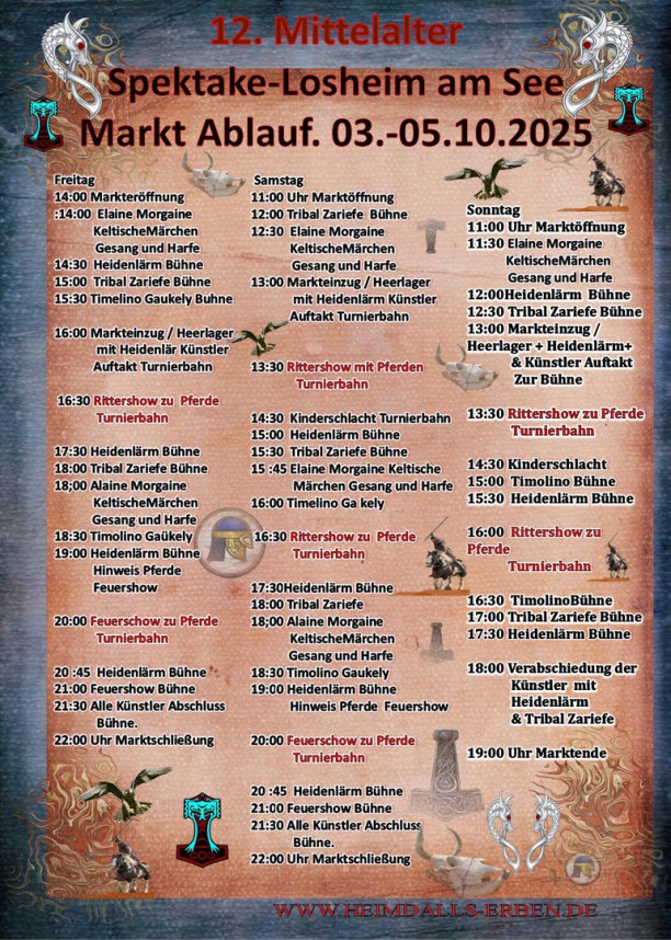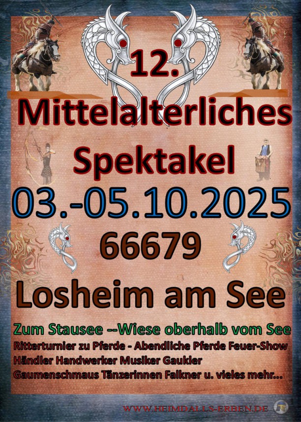 Ritter, Wikinger, Musiker, Gaukler, Wahrsagerei, Handwerker und Lagergruppen werden am 03. - 05. Oktober, 2025, wieder den Markt in Losheim am See bevölkern. Zum 12. Mal veranstaltet Heimdalls-Erben ein mittelalterliches Spektakel an dem schönen Stausee.